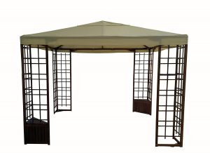 un modello dal classico stile e un design rivolto alla massima funzionalità. La struttura si compone di quatto robusti pali d’appoggio ad angolo che offrono anche una piccola superficie d’appoggio (da sfruttare anche per piccole fioriere) nella parte interna del gazebo. Le stecche delle parti verticali della struttura si uniscono a formare dei quadrati, belli da vedere da un punto di vista estetico, ma anche funzionali in termini di solidità generale. Ottima la copertura in poliestere da 230 grammi/metro quadrato che poggia su 8 robuste stecche. Dimensioni: 3x3m. Prezzo: 463,10 euro.